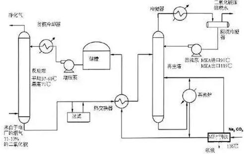 主要工藝原理: 工藝流程主要由三部分組成:以吸收塔為中心,輔以噴水冷卻及增壓設(shè)備;以再生塔和再沸器為中心,輔以酸氣冷凝器以及分離器和回流系統(tǒng);介于以上兩者之間的部分,主要有富酸氣吸收液、再生吸收液換熱及過濾系統(tǒng)。 從爐后經(jīng)除塵、脫硫后引來的煙氣溫度約為50℃,經(jīng)設(shè)置在CO2捕集裝置吸收塔前的旋流分離裝置將煙氣中的石膏液滴脫除并降塵,然后進(jìn)入煙氣冷卻器中與循環(huán)冷卻水換熱,使其溫度降到~40℃,達(dá)到MEA理想吸收溫度,通過氣水分離器除去游離水后經(jīng)增壓風(fēng)機加壓后直接進(jìn)入捕集裝置吸收塔進(jìn)行CO2吸收[煙霧凈化機]。 設(shè)置煙氣預(yù)處理系統(tǒng),脫除煙氣脫硫后攜帶的粉塵、水等雜質(zhì)對系統(tǒng)的長期穩(wěn)定運行有利,同時使用抗氧化劑和緩蝕劑,吸收劑消耗低,設(shè)備腐蝕小。增壓風(fēng)機用來克服氣體通過捕集裝置吸收塔時所產(chǎn)生的阻力。 在捕集裝置吸收塔中,煙氣自下向上流動,與從上部入塔吸收液形成逆流接觸,使CO2得到脫除,凈化后煙氣從塔頂排出。由于MEA具有較高的蒸汽壓,為減少MEA蒸汽隨煙氣帶出而造成吸收液損失,通常將吸收塔分成兩段,下段進(jìn)行酸氣吸收,上段通過水洗,降低煙氣中的MEA蒸汽含量。